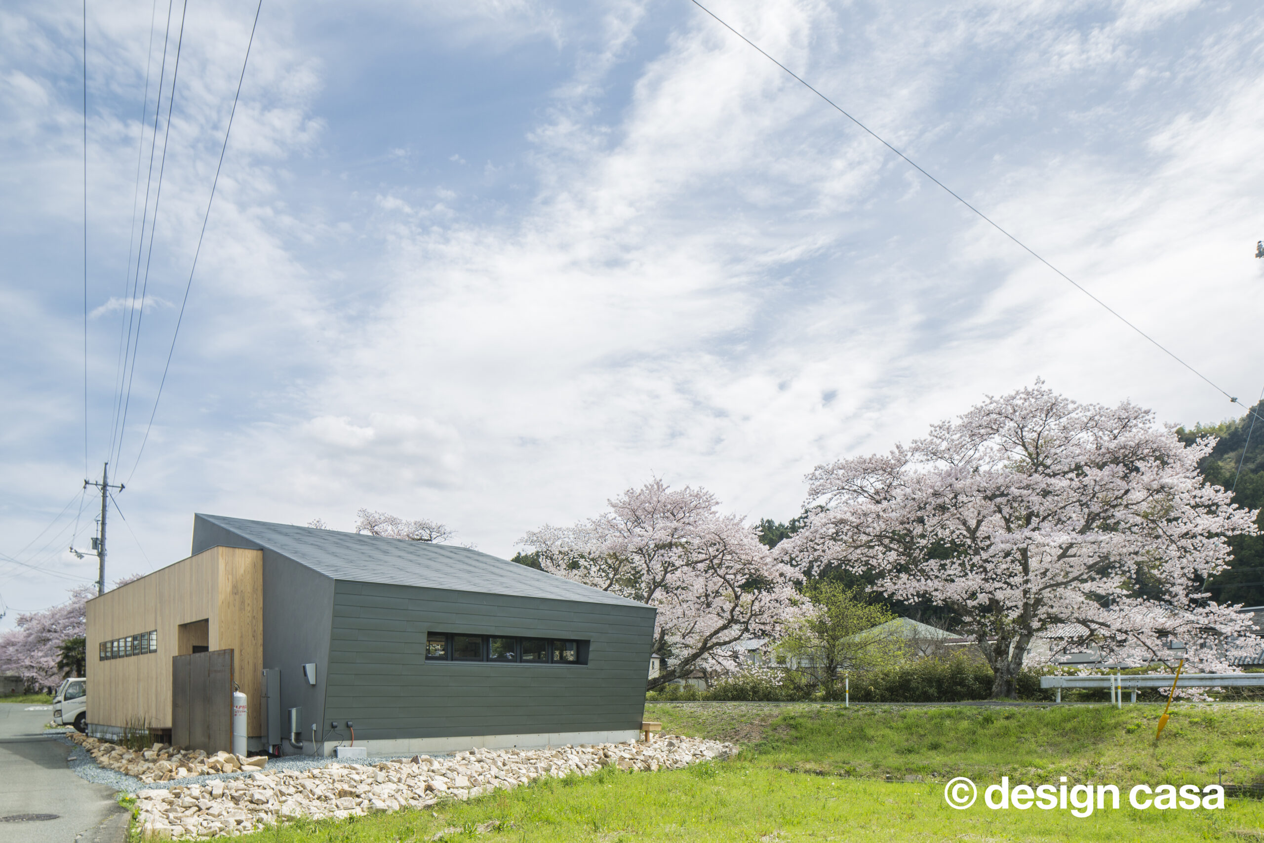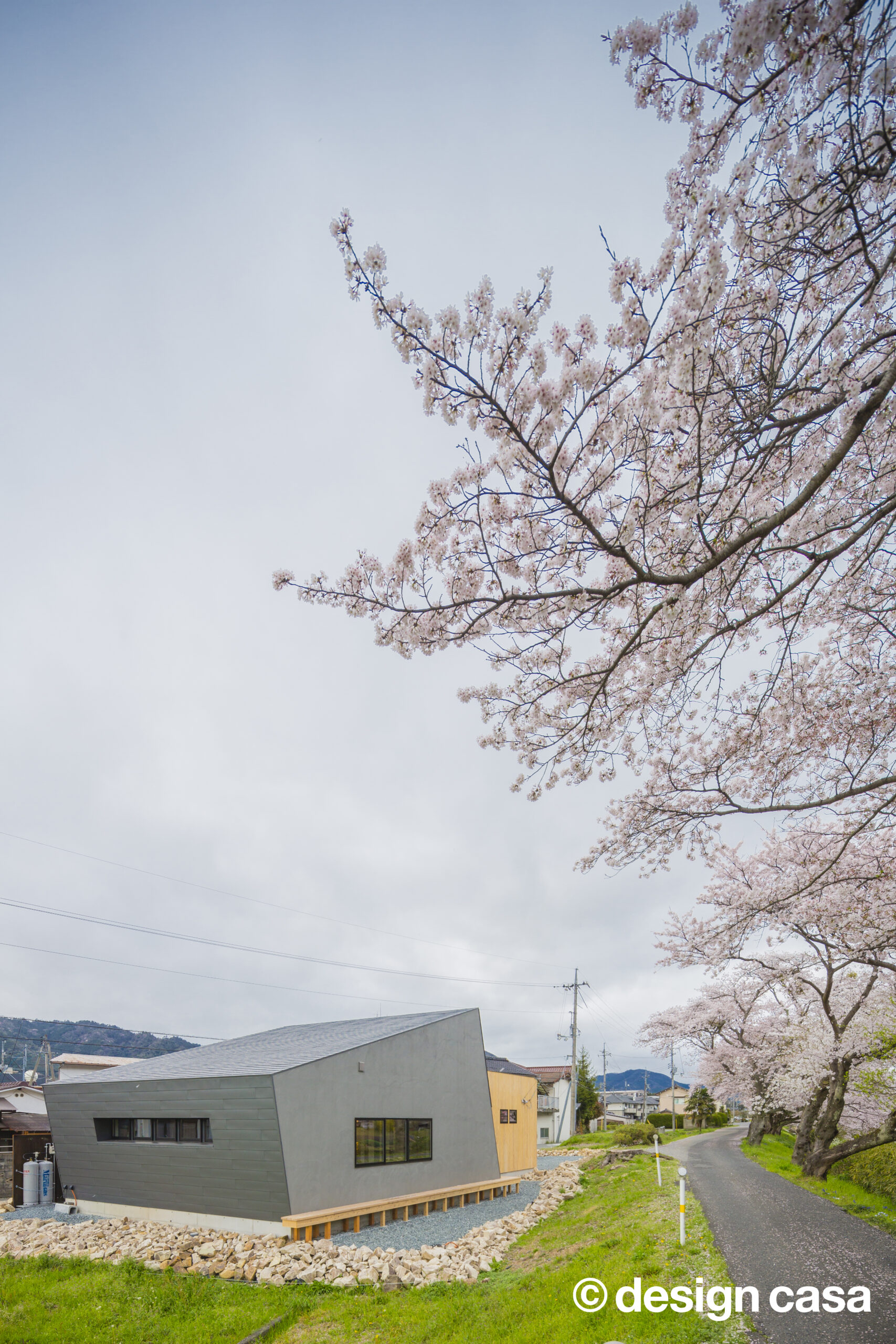 川沿いの桜並木の横に建つ一軒家。
