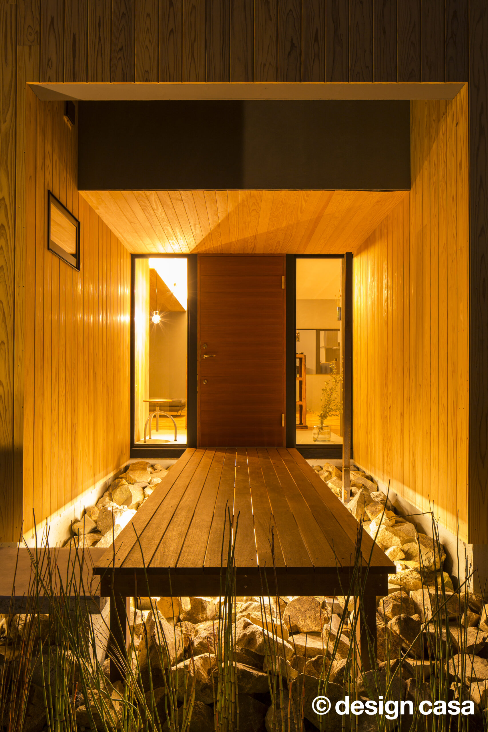 木を基調とした部分と、グレーの外装部分の2つの変形した形を繋げた特徴的なデザインが目を惹きます。
